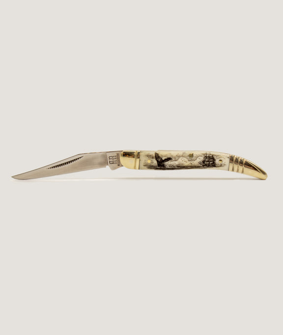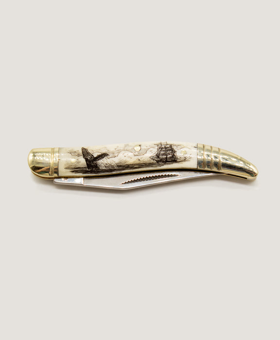 Ox bone handle, Stainless Steel bolsters and 440 steel blade. The blades measures 3inches and is non locking. I buy the knives from Frost Cutlery and then send them to scrimshaw artist Gerry DuPont to hand engrave and ink each piece. Gerry signs his work with a small “D” near the water line.