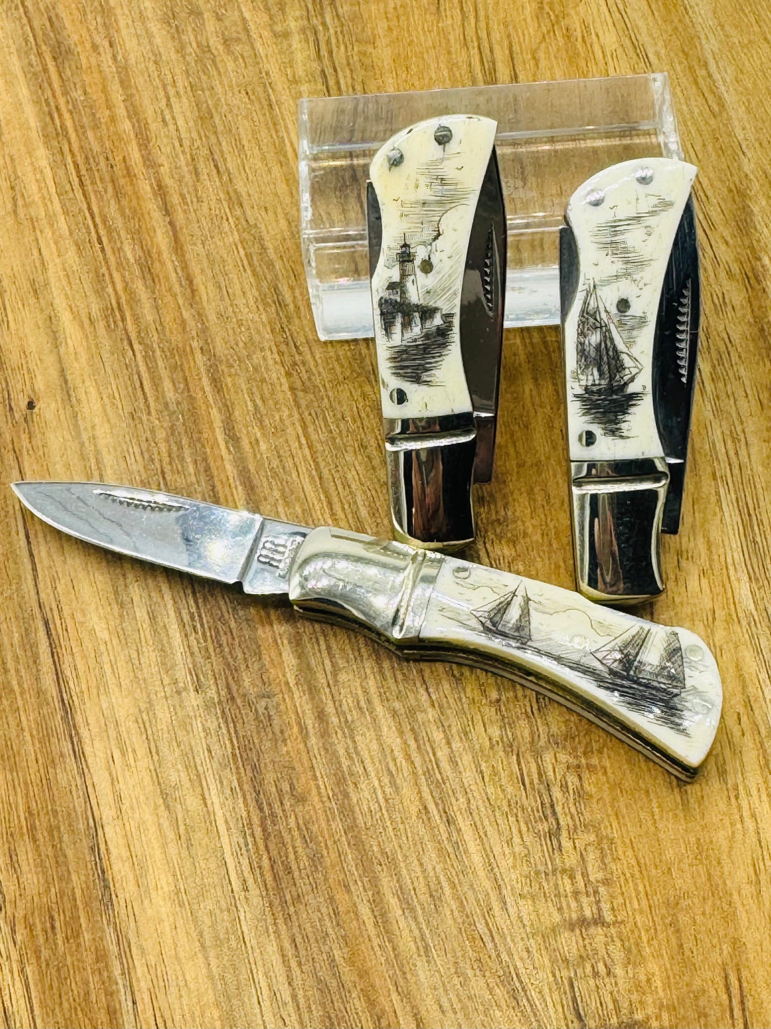 Ox bone handle, Stainless Steel bolsters and 440 steel blade. The knife closed measures 2inches and The blade measures 1.25 inches. I buy the knives from Frost Cutlery and then send them to scrimshaw artist Gerry DuPont to hand engrave and ink each piece. Gerry signs his work with a small “D” near the water line.
