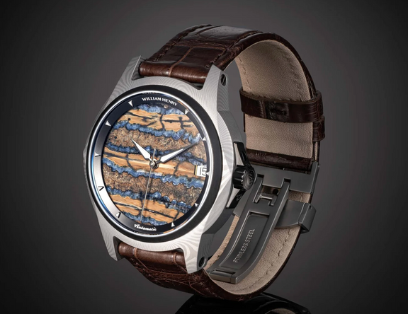 The Legacy watch represents William Henry's commitment to storytelling through exceptional craftsmanship. Each timepiece features a one-of-a-kind dial crafted from fossilized mammoth tooth—a 10,000-year-old relic carefully sourced from riverbeds and ocean floors. The material undergoes a meticulous two-year drying process before being vacuum-stabilized with resin, revealing distinctive patterns and colors unique to each piece. Housed in a forged Damascus steel case, this limited-edition watch merges ancient history with contemporary design, transforming a prehistoric artifact into a wearable narrative that connects past and present on your wrist.