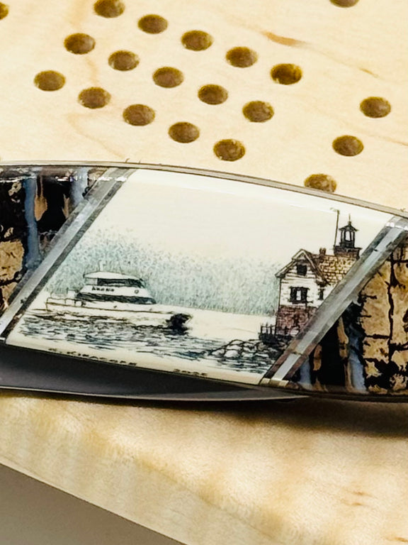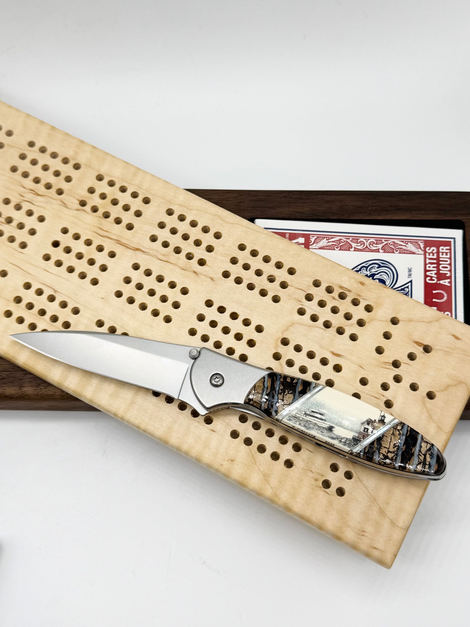 The Kershaw Leek, a masterpiece of modern blade design by Ken Onion, reaches new heights. Featuring genuine Mammoth tooth and tusk scales, this knife showcases museum-quality scrimshaw artistry by artist Gary Kiracofe. The intricate engraving depicts the historic Arnold Transit Ferry gracefully navigating the Straits of Mackinac, with the iconic Round Island Lighthouse standing in the background. Truly a one-of-a-kind pocket knife that any collector would be proud to have in their collection.