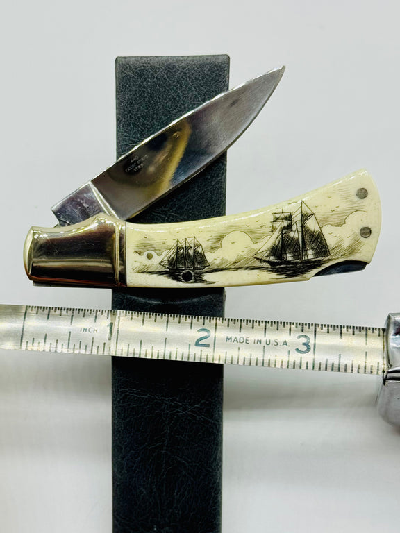 This traditional lock back knife features a 2-inch 440 steel blade paired with a 3.5-inch ox bone handle, delivering reliable cutting performance in a compact design. The handle showcases authentic scrimshaw artistry by renowned craftsman Gerry Dupont, with his signature "D" etched along the waterline—a hallmark of quality handwork. The lock back mechanism ensures secure blade engagement during use. A distinctive piece that combines functional steel with timeless bone carving craftsmanship.