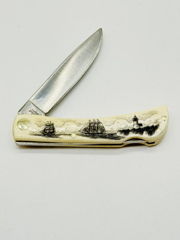 This traditional scrimshaw pen knife showcases the meticulous artistry of master craftsman Gerry Dupont, whose signature "D" graces the waterline. Hand-etched ox bone scales display intricate detail work characteristic of authentic scrimshaw craftsmanship. The compact 3.25-inch closed length and 2.5-inch 440 stainless steel blade make it equally suited for display or practical use. A refined collectible for those who appreciate fine handmade cutlery and maritime heritage.
