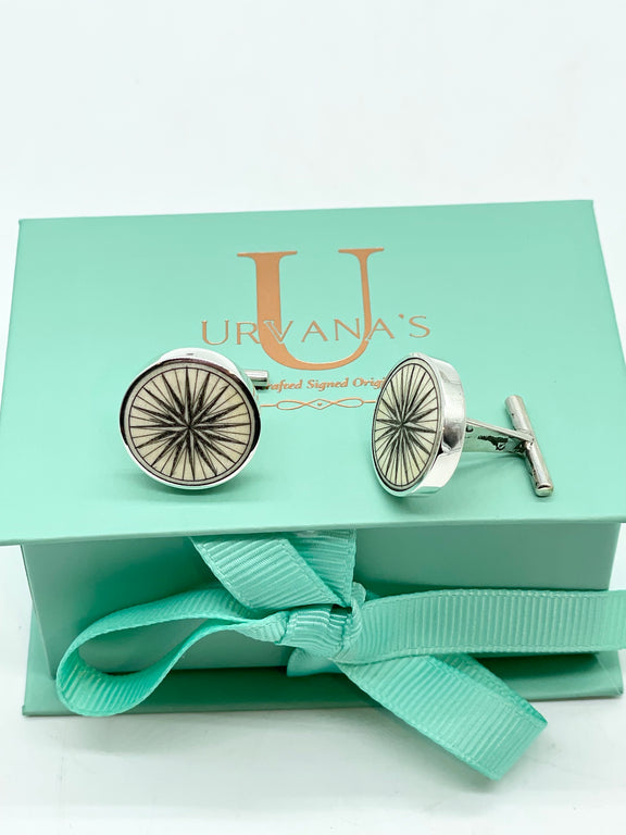 These have been created by two artist. Jim Jenkins Sterling Silver with inlayed ancient mammoth tusk cuff links and David Smith who beautifully scrimshawed these all by hand. Very Beautiful and Very Special