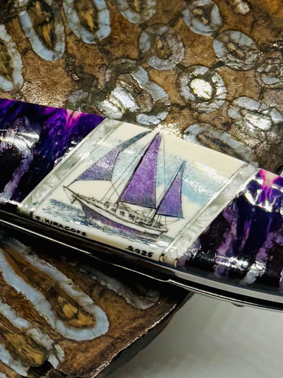 This exceptional Kershaw Leek, designed by legendary blade craftsman Ken Onion, features an assisted-opening pocket knife with authentic mammoth molar and ivory inlays meticulously scrimshawed by master artisan Gary Kiracofe. Each piece is entirely unique, showcasing intricate hand-carved details that elevate it beyond a functional tool into a true collector's treasure. The combination of Kershaw's precision engineering with Kiracofe's scrimshaw mastery creates an heirloom-quality knife that appeals to discerning collectors who appreciate both technical excellence and artistic craftsmanship.