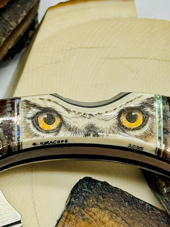 This exceptional Spyderco Dragonfly represents the pinnacle of custom knife artistry. Featuring genuine mammoth molar inlays paired with scrimshawed mammoth tusk, each piece showcases the masterful engraving work of renowned artist Gary Kiracofe. The intricate scrimshaw detailing transforms the handle into a gallery-quality collectible, while the Dragonfly's legendary blade geometry ensures practical cutting performance. A true fusion of functional design and fine art—a singular treasure for discerning knife enthusiasts and collectors.