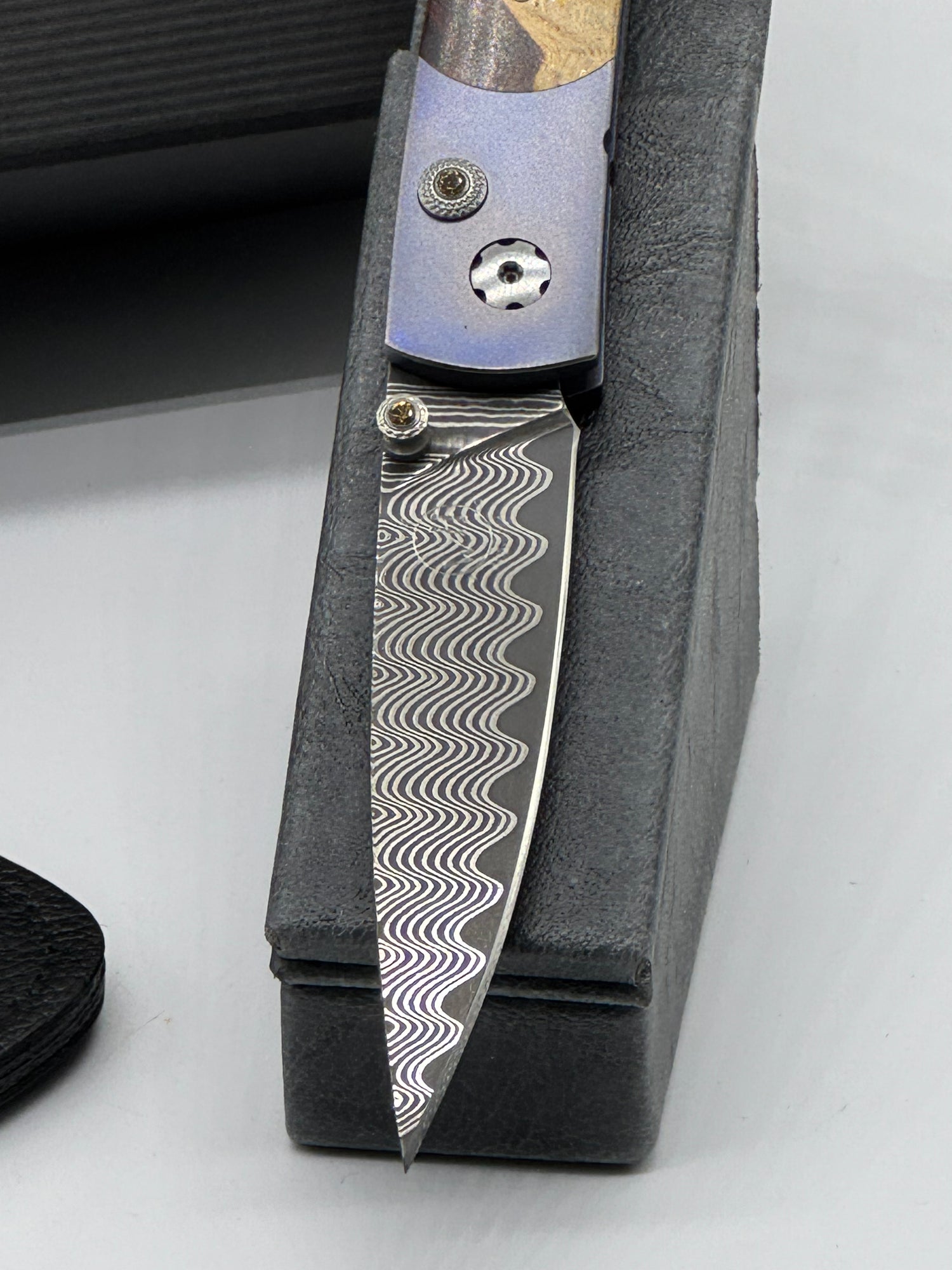 The Lancet 'Desert Blues' features a light and resilient frame in aerospace-grade titanium, inlaid with desert ironwood. The blade is 'Wave' damascus with an extra-strong VG-10 core; the one-hand button lock and the thumb stud are set with citrines. Only 100 made #12/100